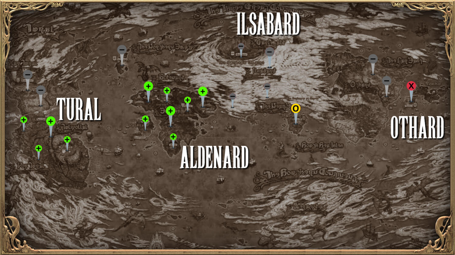 Map Key: Secured (+), Preparing (?), Open (O), Weak Hold (!), Strong Hold (X), Unavailable (–)